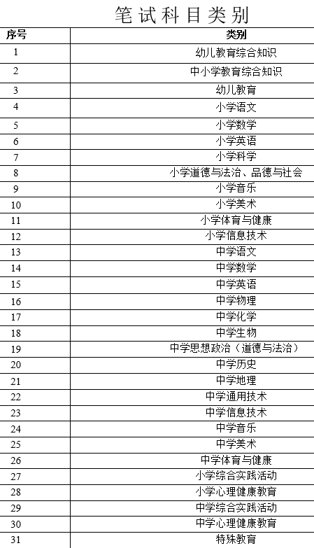 4月30日,全省統(tǒng)一考試。筆試科目包括“教育綜合知識(shí)”和“專業(yè)知識(shí)”!敖逃C合知識(shí)”分為“幼兒教育綜合知識(shí)”與“中小學(xué)教育綜合知識(shí)”,“專業(yè)知識(shí)”科目共設(shè)29個(gè)專業(yè)類別(附件2),由報(bào)考者根據(jù)本人所報(bào)考崗位相對(duì)應(yīng)的專業(yè)類別參加考試。