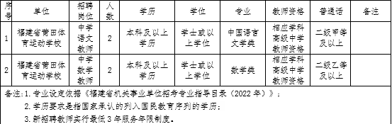 為確保福建省莆田體育運動學校正常教學對師資的需要,根據省教育廳、省委編辦、省財政廳、省人社廳《關于進一步做好全省中小學幼兒園教師補充工作的若干措施》(閩教規(guī)〔2022〕3號)和省教育廳、省人社廳《關于做好2022年全省中小學幼兒園教師公開招聘工作的通知》(閩教師〔2022〕8號)精神,結合福建省莆田體育運動學校實際情況,莆田市體育局將組織實施2022年福建省莆田體育運動學校公開招聘新任教師工作,現將有關事項公告如下: