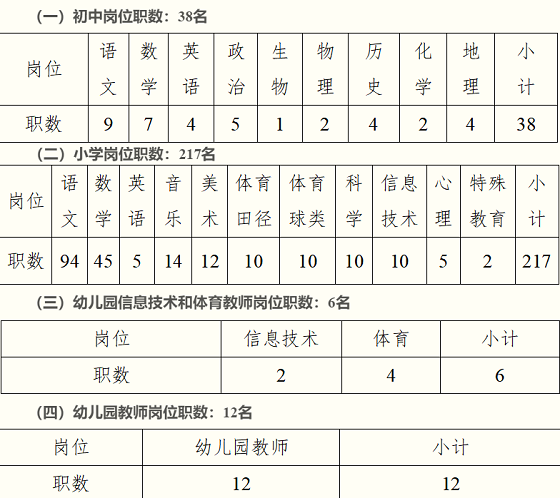 各崗位招聘職數(shù)與報名人數(shù)必須達到1:5(含1:5)的比例方能開考;如未按比例達到相應報名人數(shù)的崗位,由區(qū)教師招聘領導小組根據(jù)實際情況調(diào)整各學科崗位職數(shù)。具體如下: