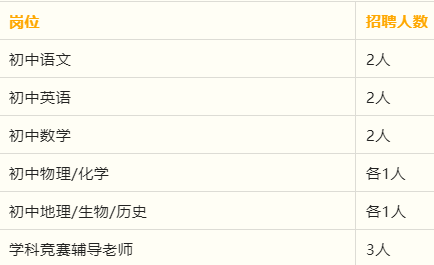 備注:音樂、體育、美術、信息及小學部其他教師崗位也可報名,面試通過后作為人才儲備,需要時優(yōu)先錄取,儲備崗位的薪資標準與表格中招聘崗位不完全一致,以具體通知為準。