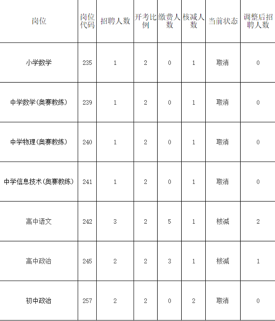 目前報名、繳費工作已結(jié)束,共有7個崗位報名人數(shù)達不到規(guī)定的開考比例,F(xiàn)根據(jù)上述規(guī)定,決定核減(取消)下列崗位公開招聘計劃: