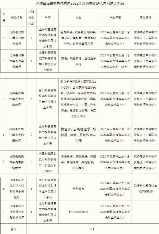 滄源自治縣教育體育局2022年度急需緊缺人才引進(jìn)計(jì)劃表