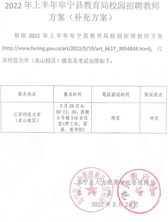 2022年上半年江蘇鹽城阜寧縣教育局校園招聘教師方案(補(bǔ)充方案)