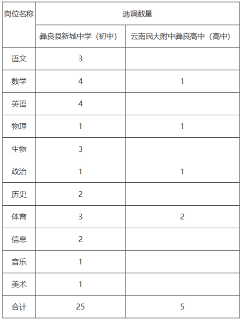 為充實學校教師隊伍,廣泛吸納人才,經昭通市彝良縣委、縣政府同意,彝良縣新城中學、昭通市云南民大附中彝良高級中學(以下簡稱“云南民大附中彝良高中”)2022年面向全國公開選調在職在編教師,現(xiàn)將相關事項公告如下: