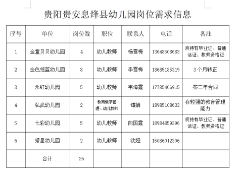 貴陽貴安息烽縣幼兒園崗位需求信息