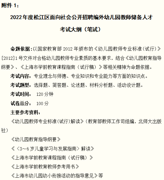 2022年松江區(qū)編外幼兒園教師招聘統(tǒng)一筆試由區(qū)教育局組織實(shí)施。