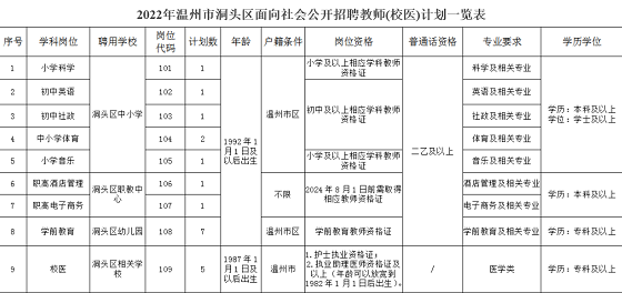 招聘單位、具體崗位和要求詳見《2022年溫州市洞頭區(qū)面向社會公開招聘教師(校醫(yī))計劃一覽表》(附件1)。