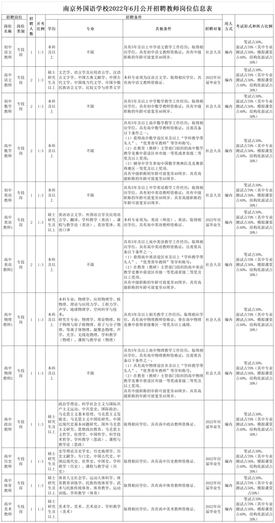本次招聘相關(guān)信息在南京市人力資源和社會(huì)保障局網(wǎng)(http://rsj.nanjing.gov.cn)、南京市教育局網(wǎng)(http://edu.nanjing.gov.cn)發(fā)布,具體崗位要求如下:
