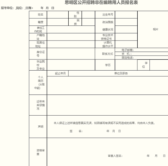 (1)填寫完整的《思明區(qū)公開招聘非在編聘用人員報(bào)名表》一份(相片可用插入文本框粘貼,詳見附件1)。