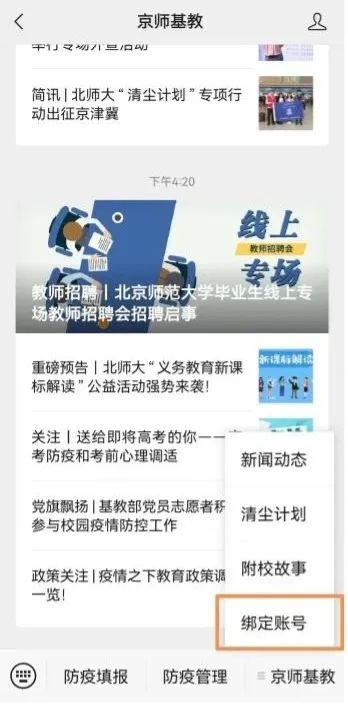 進入微信公眾號,點擊菜單欄“京師基教”,選擇“綁定賬號”,按照相關(guān)提示完成操作(如下圖);