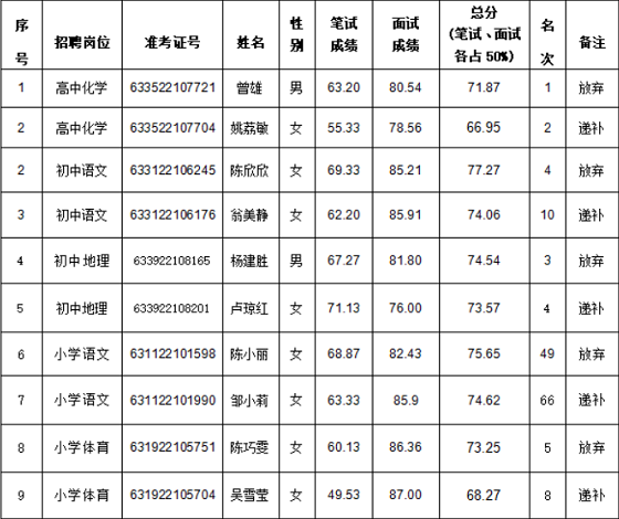 2022年6月24日,荔城區(qū)教育局組織2022年公開招聘中小學(xué)新任教師擬入圍考生體檢,高中化學(xué)第1名曾雄,初中語文第4名陳欣欣、初中地理第3名楊建勝,小學(xué)語文第49名陳小麗、小學(xué)體育第5名陳巧雯五位考生缺席,選擇放棄。根據(jù)《2022年莆田市荔城區(qū)公開招聘新任教師方案》“體檢、考核缺席或不合格,或放棄聘用而造成招考職位空缺的,原則上招聘單位主管部門應(yīng)從報(bào)考該崗位進(jìn)入面試的人員中按照考試總成績由高到低確定遞補(bǔ)人選”之規(guī)定,高中化學(xué)第2名姚荔敏、初中語文第10名翁美靜、初中地理第4名盧瓊紅,小學(xué)語文第66名鄒小莉、小學(xué)體育第8名吳雪瑩五位予以遞補(bǔ)擬進(jìn)入體檢、考核環(huán)節(jié),具體如下: