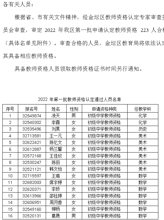 2022年江蘇常州市金壇區(qū)教育局關(guān)于公布第一批面向社會認(rèn)定教師資格結(jié)果的通告