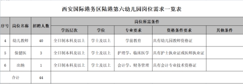 本次招聘采用“先面試、后筆試”的程序。招聘總數(shù)44人,其中幼兒教師40人,保健醫(yī)3人,出納1人,具體工作崗位、人數(shù)及其他要求詳見(jiàn)附件《西安國(guó)際港務(wù)區(qū)陸港第六幼兒園崗位需求一覽表》。