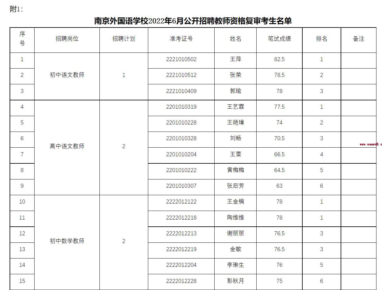 根據(jù)《南京市教育局部分直屬學(xué)校2022年6月公開招聘教師公告》(寧事招公告(R)﹝2022﹞38號)的要求,現(xiàn)將進(jìn)入資格復(fù)審的考生名單予以公示(詳見附件)。