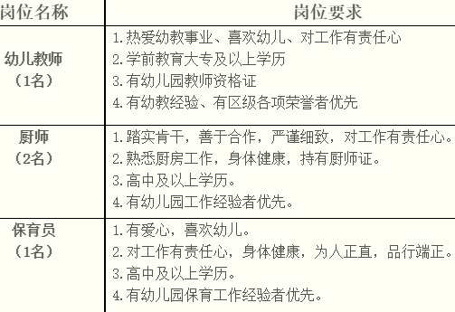 我們以“以和為美、以和創(chuàng)美、以和促美”為我園辦園目標(biāo);讓每位孩子彰顯自我,讓每位教師幸福從教是我們的辦園宗旨。我們以真實(shí)的自我與孩子相遇,用專業(yè)的知識(shí)陪伴孩子成長(zhǎng)。推崇“和”文化,和家園,就想“和”你一起,圓家人般的幸福圓夢(mèng)!現(xiàn)因幼兒園發(fā)展需要,誠(chéng)聘幼兒教師、廚師及保育員若干名: