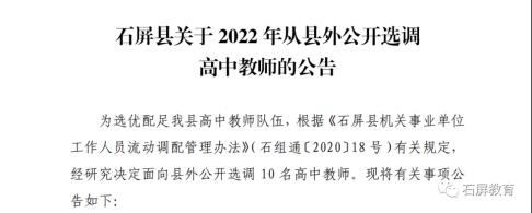 2022云南紅河州石屏縣從縣外選調(diào)高中教師公告【10人】
