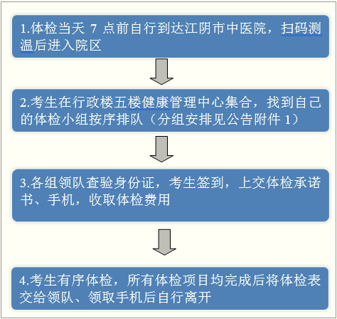 1、請(qǐng)考生帶好身份證原件(其余證件一律無(wú)效)、體檢承諾書(shū)(見(jiàn)附件2,請(qǐng)預(yù)先下載填寫(xiě)好)于體檢當(dāng)天早上7:00前到江陰市中醫(yī)院(人民中路130號(hào),公交6路、8路、9路、10路、15路等到中山站下車向東步行100米左右)行政樓五樓健康管理中心集合。體檢費(fèi)由考生自理(450元,收取現(xiàn)金,請(qǐng)自備零錢)。逾期未到者,作自動(dòng)放棄處理。