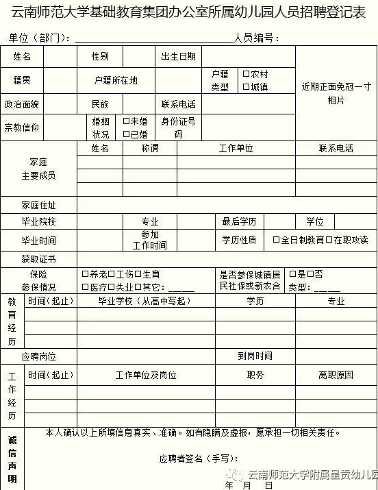 應(yīng)聘者按照招聘條件和要求,將自己的求職材料:自薦書、簡(jiǎn)歷、身份證原件、復(fù)印件和有關(guān)證明材料,《云南師范大學(xué)基教集團(tuán)辦公室所屬幼兒園人員招聘登記表》掃描件發(fā)送至郵箱326918729@qq.com進(jìn)行報(bào)名。