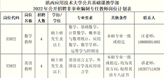 根據(jù)《滇西應(yīng)用技術(shù)大學(xué)非事業(yè)編制人員聘用管理辦法》的有關(guān)規(guī)定和實(shí)際工作需要,滇西應(yīng)用技術(shù)大學(xué)公共基礎(chǔ)課教學(xué)部2022年計(jì)劃面向社會(huì)公開招聘非事業(yè)編制專任教師8名,現(xiàn)將有關(guān)事宜公告如下。