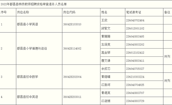 根據(jù)崗位空額數(shù)確定以下11名遞補(bǔ)人員。請按《2022年九江市中小學(xué)(幼兒園)教師招聘筆試后資格審查、調(diào)劑、遞補(bǔ)、面試及體檢等程序時間安排的公告》相關(guān)要求,于2022年7月26日上午9:00-12:00到都昌縣教育體育局進(jìn)行遞補(bǔ)資格審查。