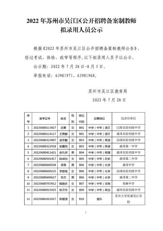 2022年蘇州市吳江區(qū)公開招聘?jìng)浒钢平處煍M錄用人員公示