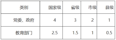 ①2020年9月以來被縣級(jí)及以上黨委、政府或教育主管部門評(píng)為優(yōu)秀教師、優(yōu)秀班主任、師德標(biāo)兵、優(yōu)秀黨員(優(yōu)秀黨務(wù)工作者)、優(yōu)秀教育工作者、最美鄉(xiāng)村教師的,按下表加分(同年度同類獎(jiǎng)項(xiàng)取最高獎(jiǎng)項(xiàng)加分,不累加)。