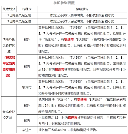 2.考生除出示“蘇康碼”綠碼,現(xiàn)場(chǎng)測(cè)量體溫<37.3℃且無(wú)干咳等可疑癥狀外,行程卡及核酸檢測(cè)頻次要求如下: