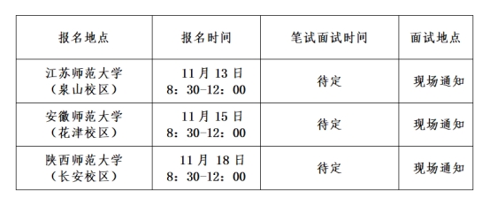 本次招聘在江蘇師范大學(xué)(泉山校區(qū))、安徽師范大學(xué)(花津校區(qū))、陜西師范大學(xué)(長安校區(qū))等地設(shè)招聘點(diǎn),采取現(xiàn)場報(bào)名的方式,所有報(bào)考人員應(yīng)遵守當(dāng)?shù)胤酪咭?guī)定,進(jìn)出校園積極配合測溫,主動出示健康碼、行程碼,自備一次性醫(yī)用口罩或無呼吸閥的N95口罩,全程佩戴,做好個人防護(hù)。