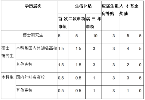 表2:各類(lèi)高校畢業(yè)生生活補(bǔ)貼、人才獎(jiǎng)勵(lì)額度(單位:萬(wàn)元)