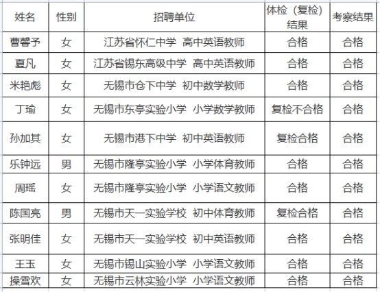 根據(jù)《無錫市錫山區(qū)教育系統(tǒng)面向2023屆全日制普通高校應(yīng)屆畢業(yè)生公開招聘事業(yè)編制教師公告》(錫人社事招公告核[2022]68號)規(guī)定,現(xiàn)將無錫市錫山區(qū)教育系統(tǒng)面向2023屆全日制普通高校應(yīng)屆畢業(yè)生公開招聘事業(yè)編制教師復檢、第二批體檢和考察結(jié)果進行公告,名單如下:
