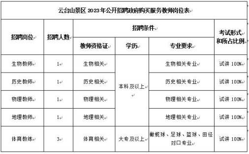 為進一步深化教育系統(tǒng)人事制度改革,選拔優(yōu)秀人才,充實教師隊伍,經(jīng)云臺山景區(qū)管委會同意,決定面向社會公開招聘政府購買服務(wù)教師7名,現(xiàn)就有關(guān)事項公告如下: