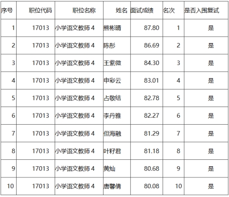 2023年2月12日洪山區(qū)政務(wù)網(wǎng)公布了2023年度事業(yè)單位公開招聘(教育系統(tǒng))入圍復(fù)試人員名單,經(jīng)核查對小學(xué)語文教師4崗位(崗位代碼:17013)網(wǎng)上公示的面試成績更正如下: