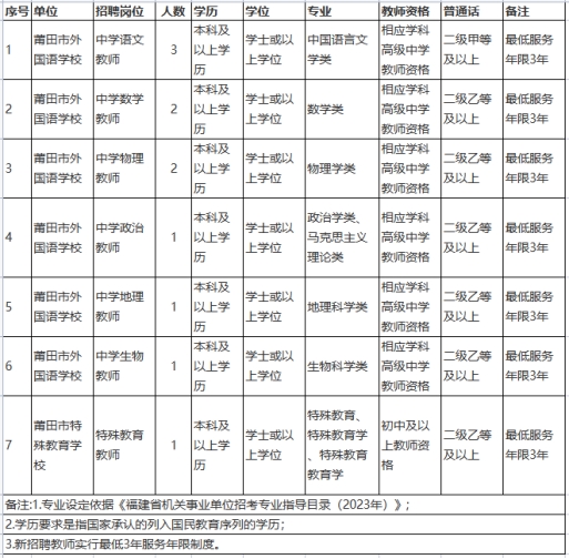 為確保市直中小學校正常教學對師資的需要,根據(jù)省教育廳、省委編辦、省財政廳、省人社廳《關于進一步做好全省中小學幼兒園教師補充工作的若干措施》(閩教規(guī)〔2022〕3號)和省教育廳、省人社廳《關于做好2023年全省中小學幼兒園教師公開招聘工作的通知》(閩教師〔2023〕27號)精神,結合市直學校實際情況,莆田市教育局將組織實施2023年莆田市市直教育系統(tǒng)中小學校公開招聘新任教師工作,現(xiàn)將有關事項公告如下: