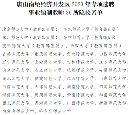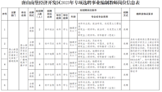 選聘事業(yè)編制教師60名。詳見《唐山南堡經(jīng)濟開發(fā)區(qū)2023年專項選聘事業(yè)編制教師崗位信息表》,以下簡稱《崗位信息表》。