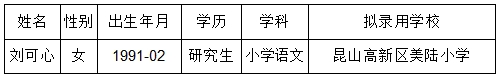 根據(jù)《2022年昆山市教育系統(tǒng)公開(kāi)招聘中小學(xué)教師簡(jiǎn)章》,劉可心(人員信息附后)已通過(guò)昆山市教育局組織的筆試、面試、體檢(因懷孕緩檢)和考察,現(xiàn)進(jìn)行錄用公示,公示時(shí)間為2023年4月12日~4月20日。如對(duì)公示對(duì)象有異議,可在公示期間向昆山市教育局反映,聯(lián)系電話(huà):57553129。