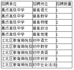 根據(jù)《寧波市事業(yè)單位公開招聘工作人員實(shí)施辦法》(甬政發(fā)〔2007〕109號)、《關(guān)于進(jìn)一步貫徹落實(shí)〈寧波市事業(yè)單位公開招聘工作人員實(shí)施辦法〉的意見》(甬人社發(fā)〔2012〕180號)和《江北區(qū)事業(yè)單位工作人員陽光招錄實(shí)施辦法》(北區(qū)委辦〔2013〕75號)的有關(guān)規(guī)定,結(jié)合江北區(qū)教育事業(yè)發(fā)展的需要,寧波市江北區(qū)決定面向社會公開招聘事業(yè)編制教師45名,其中惠貞高中7名,義務(wù)段38名,現(xiàn)就有關(guān)事項(xiàng)公告如下: