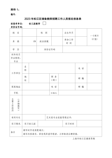 2.報(bào)名須知。報(bào)名時請下載并打印好《2023年松江區(qū)儲備教師招聘工作人員報(bào)名信息表》(附件1),本人一寸免冠近照2張(其中一張?jiān)趫?bào)名表上貼好),同時本人攜帶身份證、戶口簿、學(xué)歷證書、幼兒園教師資格證書、普通話水平測試等級證書等原件、復(fù)印件在預(yù)約時段來中心進(jìn)行現(xiàn)場報(bào)名。區(qū)教育局對報(bào)名人員進(jìn)行報(bào)名資格審查。(提示:綠色出行,教育黨群與人才服務(wù)中心周邊不提供車位)
