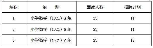 小學(xué)數(shù)學(xué)(1021)崗位共招聘34名,按招聘公告規(guī)定比例1:2確定(最后一名同分跟進(jìn))進(jìn)入面試考生共有71人,分三組進(jìn)行面試,各組考生人數(shù)和招聘計(jì)劃見(jiàn)下表,考生通過(guò)抽簽確定分組及面試順序。