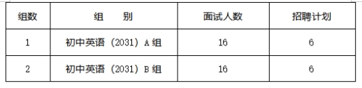 初中英語(yǔ)(2031)崗位共招聘12名,按招聘公告規(guī)定比例1:2確定(最后一名同分跟進(jìn))進(jìn)入面試考生共有32人,分二組進(jìn)行面試,各組考生人數(shù)和招聘計(jì)劃見(jiàn)下表,考生通過(guò)抽簽確定分組及面試順序。