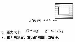 在介紹重力時,除了明確指出:物體受到的重力的大小跟物體的質(zhì)量成正比,教學中還需要補充實驗測量重力的方法,重力的大小可以用測力計測得,可以向?qū)W生們展示幾種測力計,如彈簧測力計、牽引測力計、壓力測力計等等.