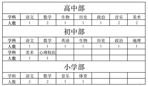 1、招聘小學(xué)、初中、高中各科教師及音體美教師,后勤工作人員若干;