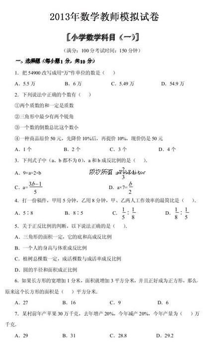 2013年小學(xué)數(shù)學(xué)教師招聘考試模擬試卷及參考答案(2)