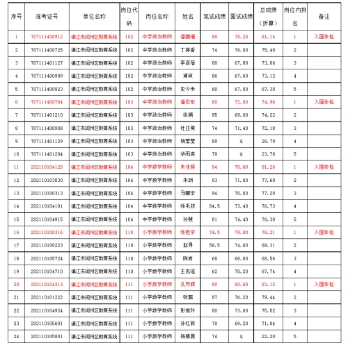 根據(jù)《2023年鎮(zhèn)江市潤州區(qū)教育系統(tǒng)公開招聘教師公告》規(guī)定,現(xiàn)將2023年潤州區(qū)教師招聘總成績(第二批)公告如下,表中紅色字體標(biāo)注人員為入圍體檢、考察人選。公告時間為7月3日至7月5日,公告結(jié)束后將組織入圍考生進(jìn)行體檢、考察,具體時間和地點(diǎn)另行通知。咨詢電話:潤州區(qū)教育局0511-85589160;監(jiān)督電話:潤州區(qū)教育局0511-85589112區(qū)人社局0511-81988369區(qū)紀(jì)委監(jiān)委0511-12388。