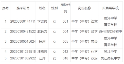 根據(jù)《2023年蘇州市吳江區(qū)教育系統(tǒng)公開(kāi)招聘教師公告》,經(jīng)過(guò)考試、體檢、考核(政審)等程序,以下擬聘用人員予以公示。