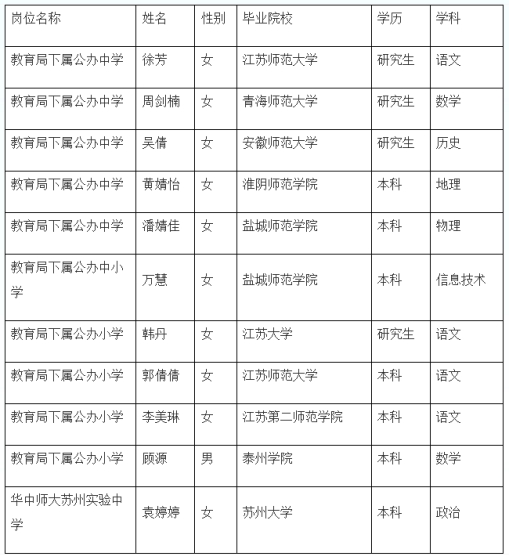 根據(jù)《2023年蘇州市吳中區(qū)教育局公開(kāi)招聘中小學(xué)教師公告》的規(guī)定,經(jīng)公開(kāi)報(bào)名、筆試、面試、體檢和考察等程序,擬錄用以下11名同志,現(xiàn)予以公示,公示時(shí)間為2023年8月3日至2023年8月11日。公示期間,如對(duì)擬錄用人員有異議,請(qǐng)署名反映情況,并提供必要的調(diào)查線索。監(jiān)督舉報(bào)電話:0512-65280959。
