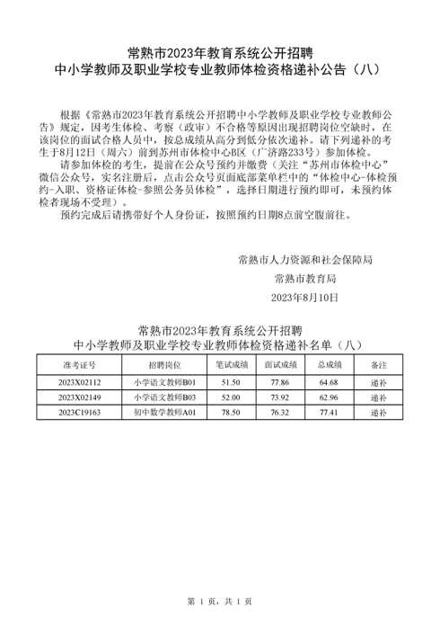 2023年蘇州常熟市教育系統(tǒng)公開招聘中小學(xué)教師及職業(yè)學(xué)校專業(yè)教師體檢資格遞補(bǔ)公告(八)