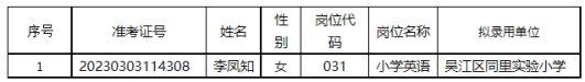 據(jù)《2023年蘇州市吳江區(qū)教育系統(tǒng)公開招聘教師公告》,經(jīng)過考試、體檢、考核(政審)等程序,以下擬聘用人員予以公示。