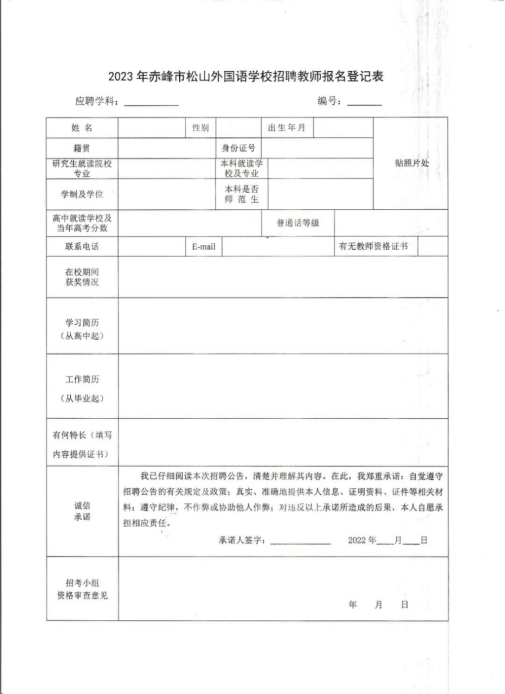 下載填寫《2023年松山外國語學(xué)校招聘教師報(bào)名登記表》