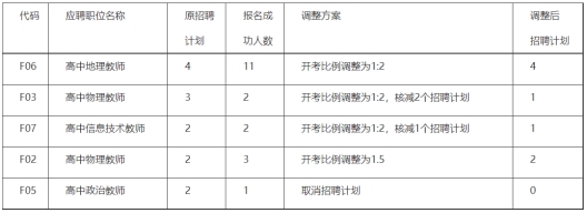 根據(jù)《響水縣教育系統(tǒng)事業(yè)單位2023年第二次公開(kāi)招聘教師公告》要求,經(jīng)過(guò)網(wǎng)上報(bào)名、資格初審等程序,目前14個(gè)職位中有103名應(yīng)聘人員通過(guò)資格初審,因部分職位審核通過(guò)人數(shù)未達(dá)開(kāi)考比例,經(jīng)我局研究,同時(shí)報(bào)縣事業(yè)單位綜合管理部門核準(zhǔn),現(xiàn)將“F06高中地理教師”等3個(gè)職位開(kāi)考比例調(diào)整為1:2;將“F02高中物理教師”緊缺學(xué)科職位開(kāi)考比例調(diào)整為1:1.5;將降低開(kāi)考比例后通過(guò)資格審核人數(shù)仍然不足的“F03高中物理教師”等2個(gè)職位,相應(yīng)核減招聘計(jì)劃3名;將只有1人報(bào)考的“F05高中政治教師”職位,取消招聘計(jì)劃2名。具體調(diào)整情況見(jiàn)下表: