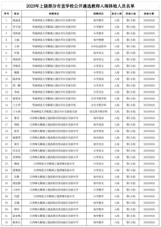 根據(jù)《華南師范大學(xué)附屬上饒經(jīng)開(kāi)區(qū)各實(shí)驗(yàn)學(xué)校2023年公開(kāi)遴選教師公告》《2023年江西師范大學(xué)附屬上饒實(shí)驗(yàn)學(xué)校面向上饒市公開(kāi)遴選教師公告》有關(guān)規(guī)定,現(xiàn)將經(jīng)過(guò)報(bào)名、資格審查、筆試、面試、考核后確定的體檢人員名單進(jìn)行公示,并將體檢事宜通知如下: